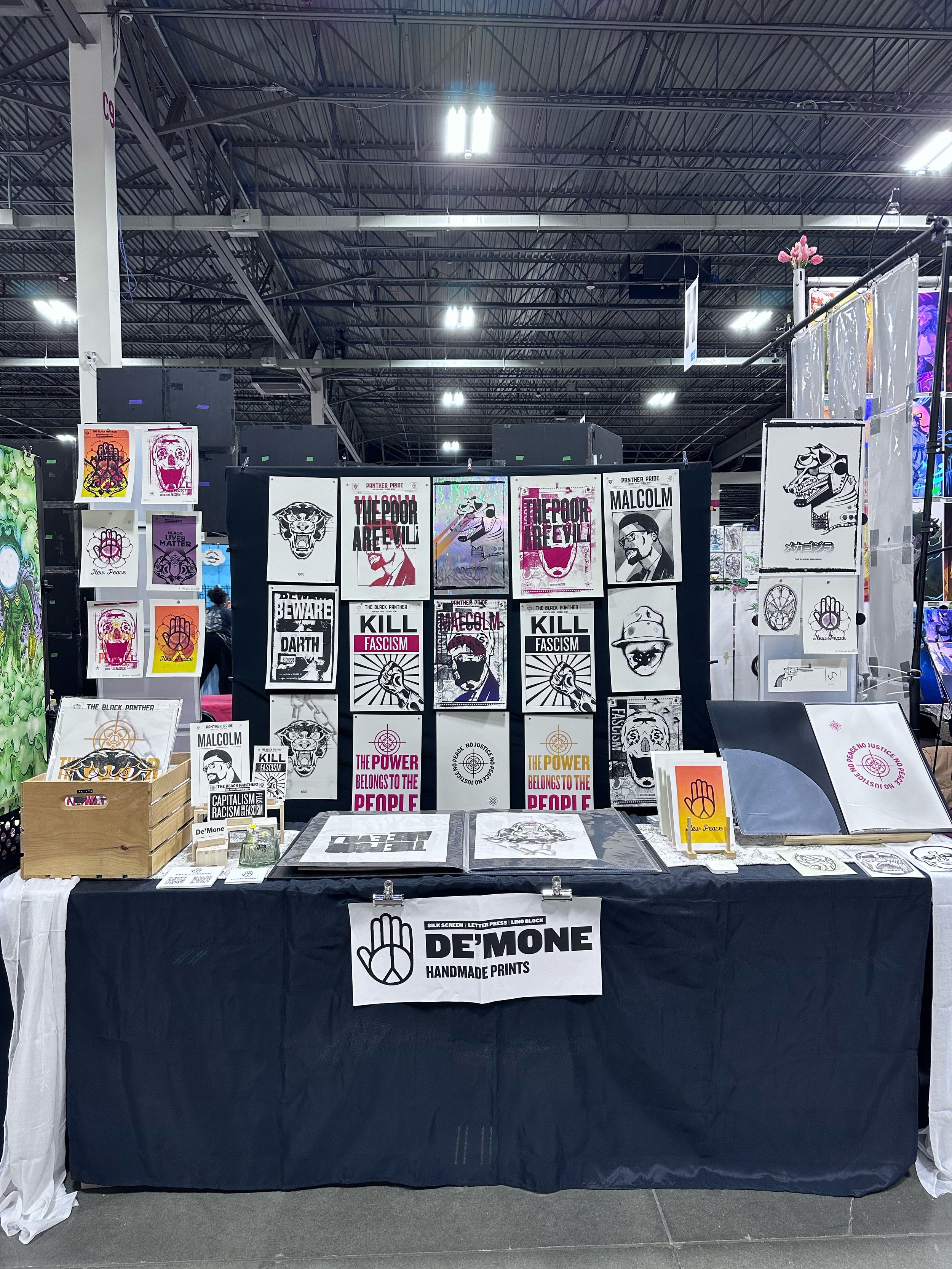 De’Mone Davis is a traditional printmaker working in silkscreen, linocut, and letterpress to create bold, message-driven imagery. Trained at Northern Michigan University and now based in Detroit, De’Mone uses the tactile nature of printmaking to amplify political and cultural narratives. Through layered color, handcrafted marks, and the physicality of ink and paper.